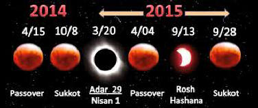 First of all, we see four Blood Moons: one on the Passover of 2014, one on the Feast of Tabernacles (Sukkot) of 2014, one on Passover of 2015, and one on the Feast of Tabernacles (Sukkot) of 2015. It is extremely rare for four Blood Moons to fall consecutively on Passovers and the Feasts of Tabernacles like this. In addition, notice the two solar eclipses in the year 2015: one falls at the beginning of the Jewish year, Nisan 1, and it is a full solar eclipse. The other falls on Rosh Hashana called the Feast of Trumpets in the Bible, and it is a partial solar eclipse. All these astronomical events seem to be revealing that something is up, especially in the year 2015 with the two Blood Moons, and the two solar eclipses. Indeed, it appears that the sun shall be [literally] turned into darkness, and the moon [literally] into blood, before that great and notable day of the Lord come.